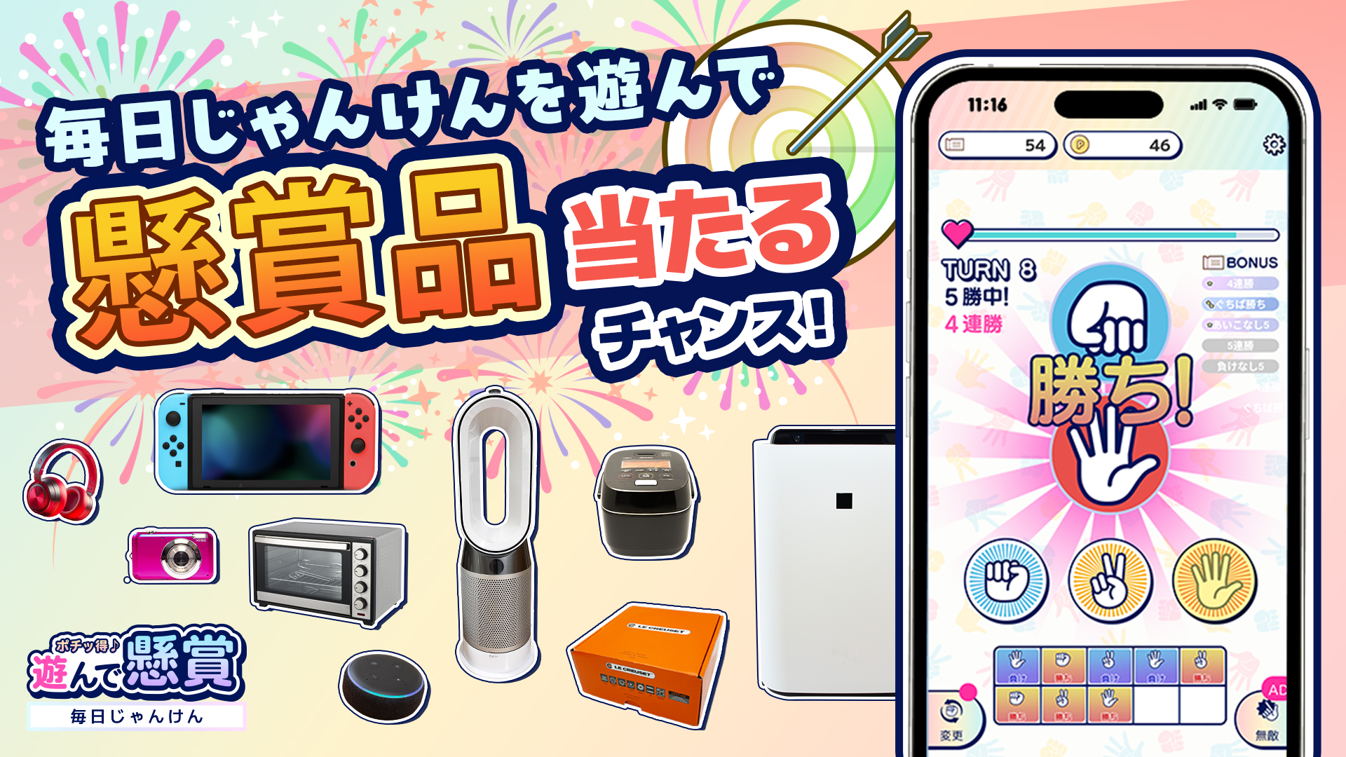 じゃんけんに勝ち進むだけで懸賞に応募できる完全無料のアプリです。じゃんけんだから、ルールを学ぶ必要がなく、誰でも簡単にすぐ始められます。