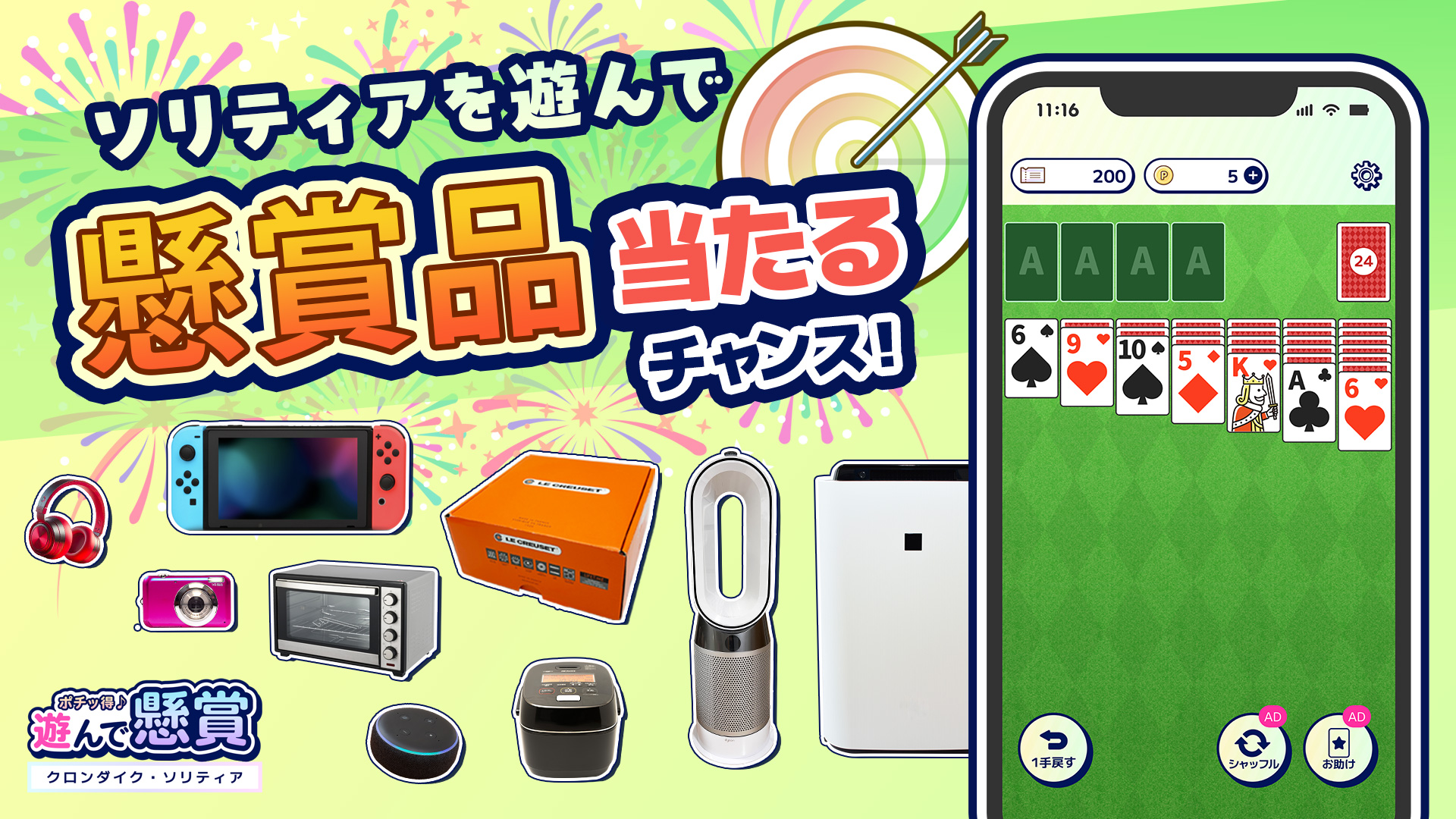 プレイするだけで懸賞に応募できる完全無料のアプリです。頭の体操としても人気のソリティアを、遊びながらお得に楽しめます。