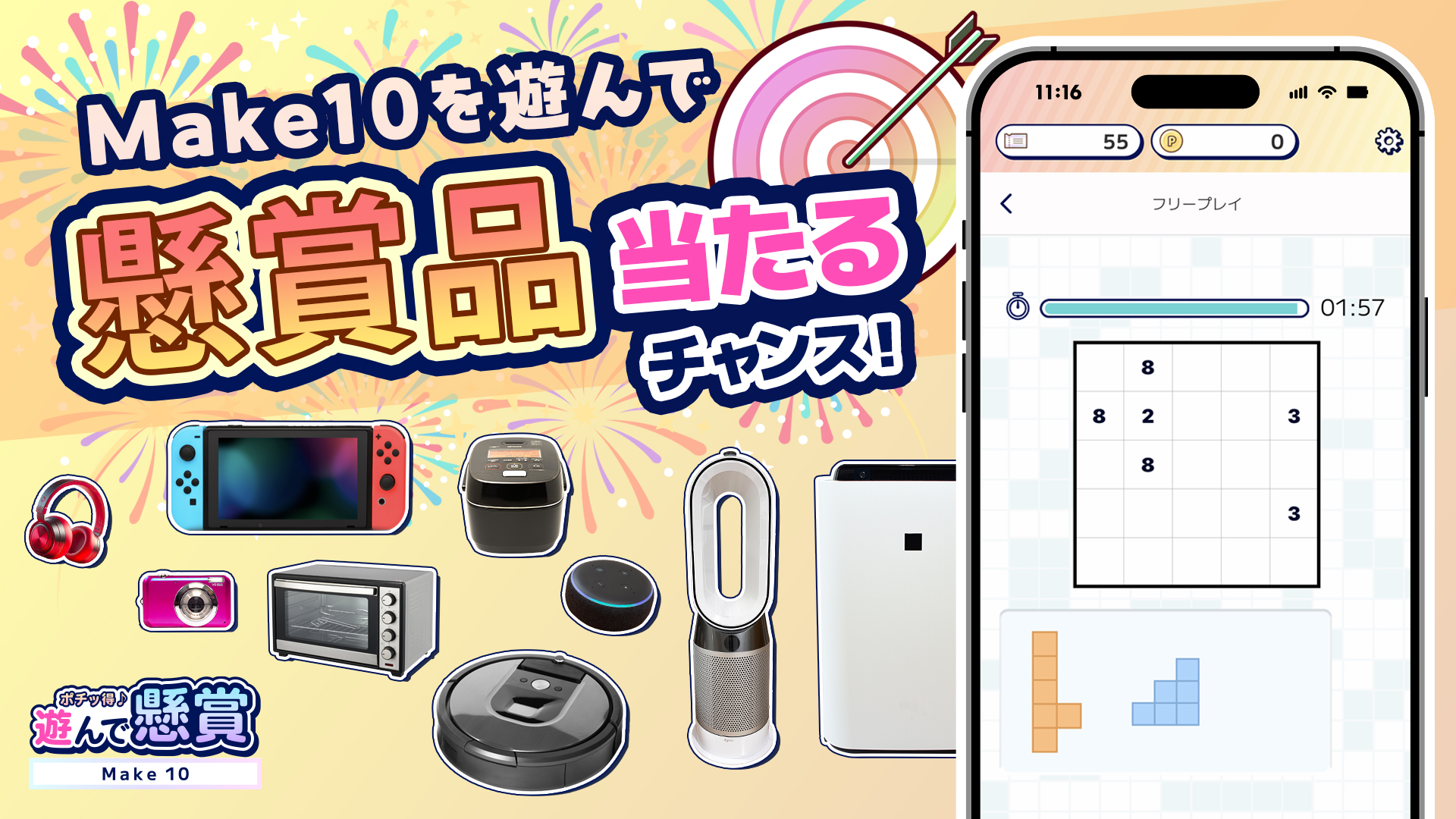 かんたんなパズルを解くだけで懸賞に応募できる完全無料のアプリです。頭の体操としても人気のMake10を、遊びながらお得に楽しめます。